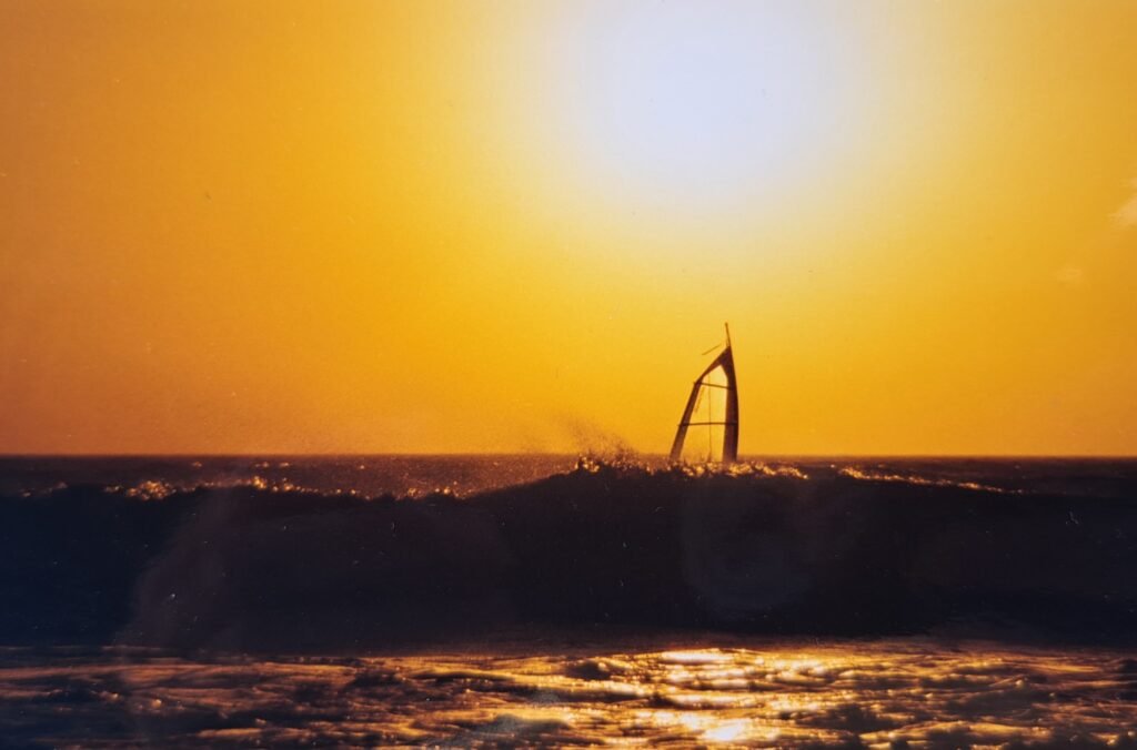Je suis né en 1977 du côté de Bordeaux. La planche à voile est apparue 9 ans plus tôt sous l’impulsion de James Drake et Hoyle Schweitzer. Pour ce sport, 77, c’est l’année d’une formidable évolution : apparition des footstraps, du harnais, 1errecord de vitesse homologué (17,1 nds !) et un Allemand qui débarque à Hawaii avec un engin qui ne flotte pas à l’arrêt et permet de surfer et sauter, le début d’une révolution !