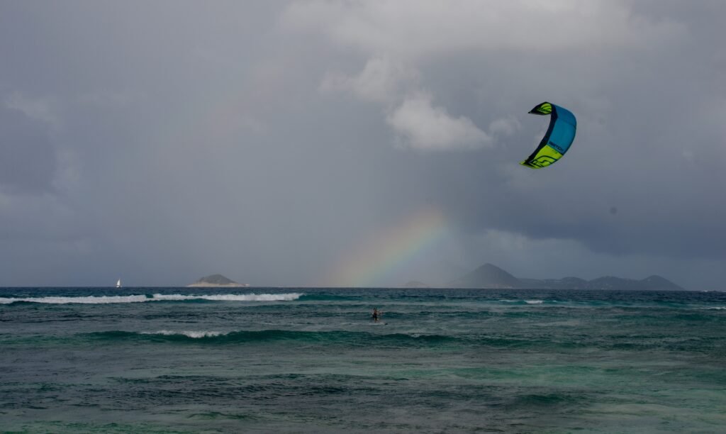 2015, après 7 ans dans l’éolien et le solaire, un voyage nous donne envie de repartir vivre dans les îles. Nous venons pourtant enfin d’acheter une maison à Pérols, à côté de Montpellier, et notre 2e fille vient de naître. Pourtant, nous quittons la région et partons nous installer en Guadeloupe ou nous restons 3 ans. Les spots de planche (Les Salines), kite (Bois-Jo) et surf (Petit Havre), sont entre 5 et 15 min de la maison. Depuis la terrasse, nous devinons les contours de Marie-Galante où je me rends souvent, comme à la Désirade, pour développer des projets de repowering visant à remplacer d’anciennes éoliennes par des modèles plus puissants et moins nombreux. Ma fille ainée fait ses premiers bords au planing en duo avec moi, puis apprend virements et empannages sur sa propre planche, à Sainte-Anne. Je profite aussi de ces années pour voyager dans la Caraïbe et naviguer en planche à la Barbade, chez Brian Talma et en kite aux Grenadines, non loin de Jack Sparrow !