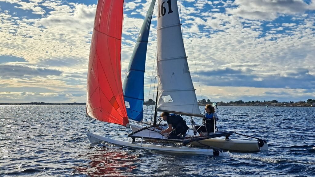Septembre 2023, grâce à Marie-Claire, alors directrice du Yacht Club de Mèze (YCM), et à Camille, moniteur, je rejoins ce club et me prépare aux tests d’entrée au BPJEPS en navigant quotidiennement, pendant près de 3 mois, en catamaran (Hobie 16) et planche à voile (Techno 293). Durant ces trois mois, je valide un niveau 3 en dériveur, 4 en cata et 5 en planche. Reste tout de même à passer les sélections en novembre. Nous sommes 26 candidats pour 16 places. Je donne tout et ça le fait ! Je ferai donc partie de la promo 2024 du BPJEPS Voile Multi-Supports (VMS) !